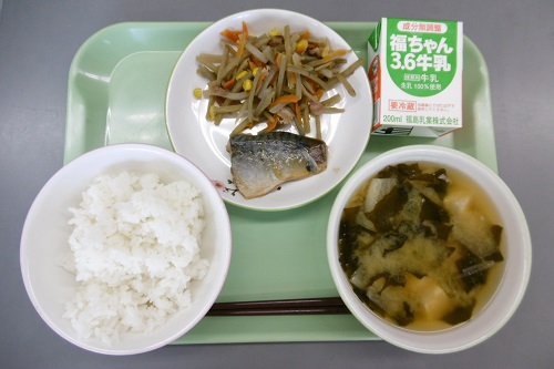 今日の給食は和食の日でした。メニューは、ごはん、牛乳、さばのみそ煮、ごぼうとベーコンのきんぴら、わかめのみそ汁でした。
