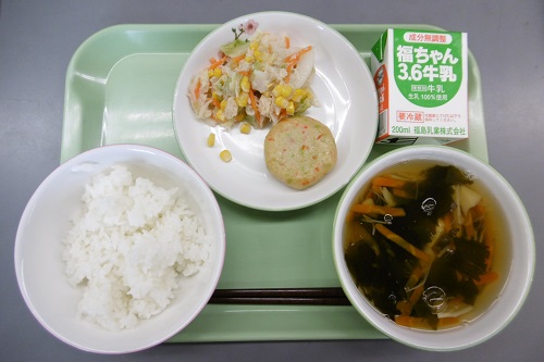 今日の給食のメニューは、ごはん、牛乳、とうふのそぼろあん包み、チキンと野菜のドレッシング和え、若竹汁でした。