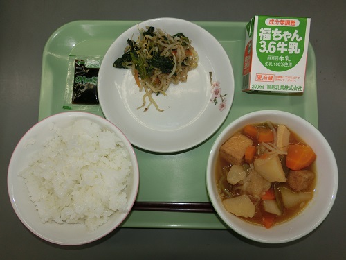 今日の給食メニューは、ごはん、のりつくだに、肉じゃが、信夫の里のおひたしでした。信夫の里のおひたしは、福島市独特の、かぶれ菜をつかったおひたしです。