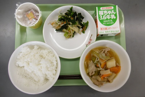 今日の給食メニューはごはん、牛乳、納豆、肉じゃが、菜花のおひたしでした。