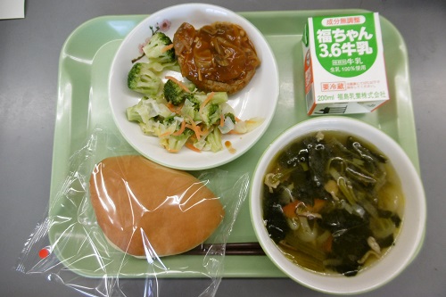 今日の給食のメニューは、サラダパン、牛乳、ハンバーグのきのこソースがけ、ブロッコリーのサラダ、五目スープでした。ハンバーグのきのこソースがけは、サラダパンに挟んで食べました。