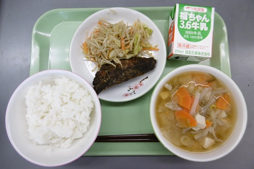 今日の給食は和食の日でかみかみ献立でした。メニューは、ごはん、牛乳、さばの立田揚げ、きんぴらサラダ、さつま汁でした。
