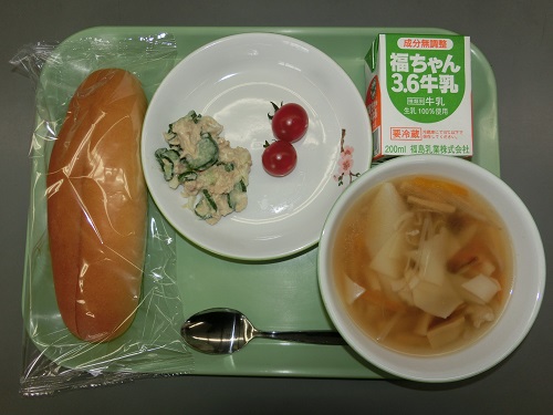 今日から美味しい給食が始まりました。今日のメニューは、切れ目コッペパン、牛乳、ツナサンドの具、ミニトマト(2こ)、ワンタンスープでした。これからどんな給食が出るのか、とても楽しみです。