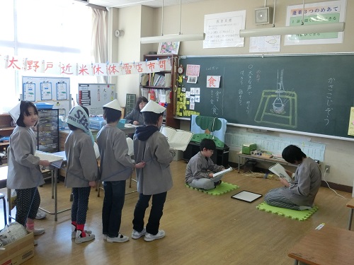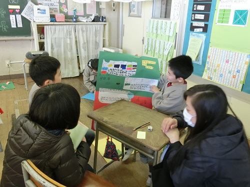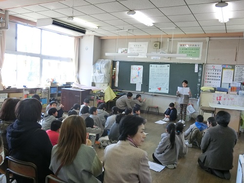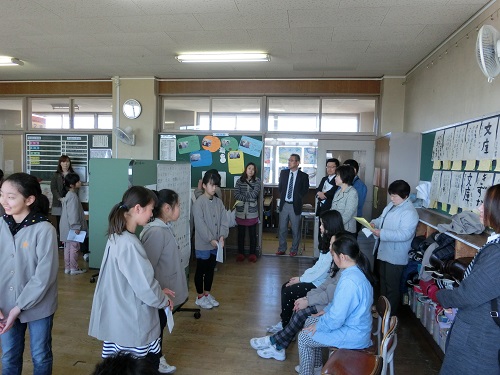 できるようになったことを発表する1・2年、チームで協力し合いできるようになったことを発表する3年1組、各地方について調べたことを発表する4年1組、環境問題について調べたことをワークショップ形式で発表する5年2組、国語科で学習したことを生かしてスピーチする6年生、かこじぞうを音読劇で発表するほうらい学級など、1年間の学習の成果を保護者の方々に参観していただきました。また、あわせて第2回の学校評議員会も開き、学校評議員の方々にも子どもたちの学習の様子を参観していただきました。