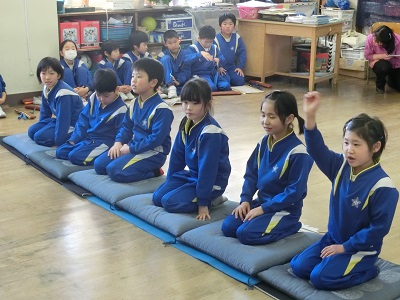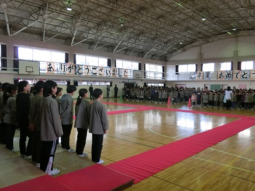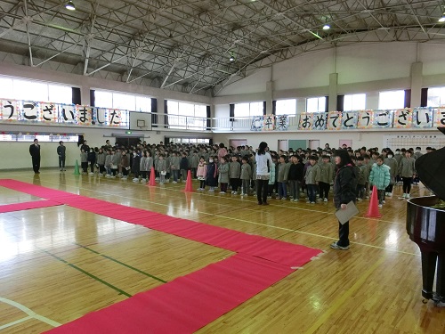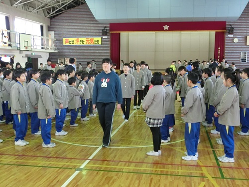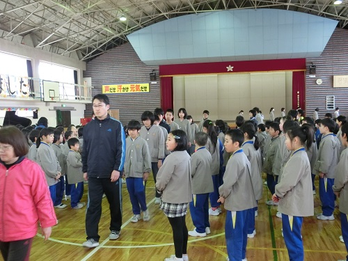 13日(月)昼休みに音楽集会がありました。卒業式の隊形で、「国歌」「校歌」「大空がむかえる朝」「旅立ちの日に」の式歌の練習をしました。最後に、卒業生の退場を1年生から5年生まで「さようなら」の歌を歌って見送るところまで練習しました。