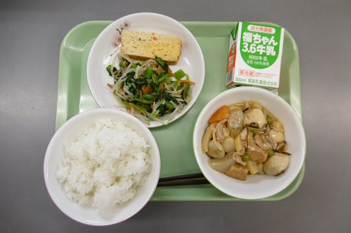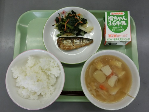 今日の給食は、和食でした。メニューは、ごはん、牛乳、いわしの梅煮、おかかサラダ、みそけんちん汁でした。
