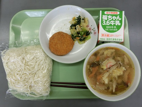 今日の給食メニューは、ソフト麺、牛乳、福島県産ポークコロッケ、アーモンドあえ、きつねうどんかけ汁でした。