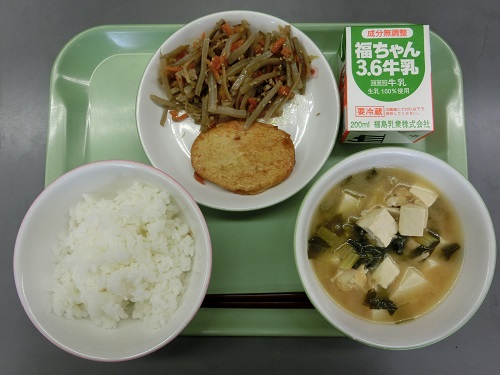 今日の給食メニューは、ごはん、牛乳、豆腐入りカレーつくね、五目きんぴら、青菜のみそ汁でした。