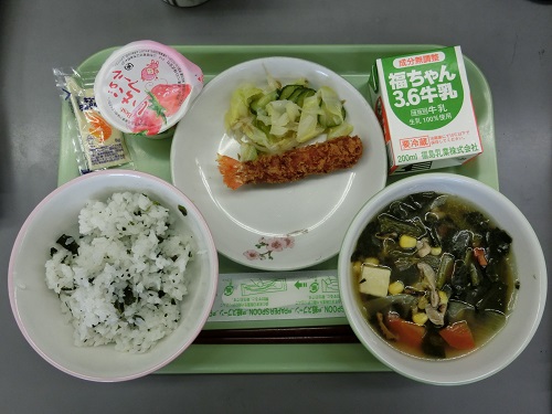 今日は、卒業お祝いおたのしみ献立でした。メニューは、わかめごはん、牛乳、タルタルソース、ほうれん草のスープ、オニオンサラダ、エビフライ、いちごパンナコッタでした。子どもたちは、美味しそうに食べていました。
