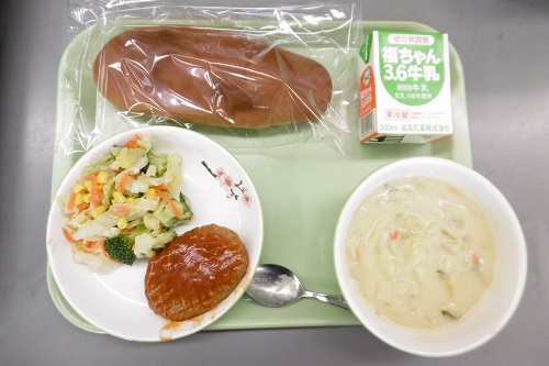 今日の給食は、立子山中学校の3年生のリクエスト献立です。メニューは、黒パン、牛乳、ハンバーグデミグラソース、ブロッコリーサラダ、クリームシチューでした。