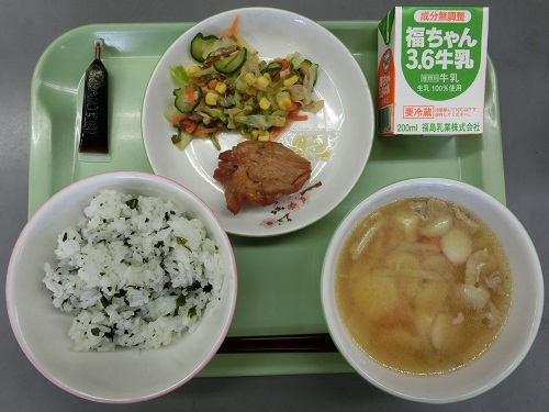 今日は、蓬莱中学校3年生のリクエスト献立でした。メニューは、わかめごはん、牛乳、ミルメーク、照り焼きチキン、りっちゃんサラダ、豚汁でした。
