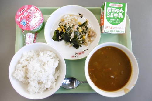 今日の給食メニューは,子どもたちの大好きなポークカレー,麦ごはん,牛乳,ツナとわかめのサラダ,ヨーグルトでした。