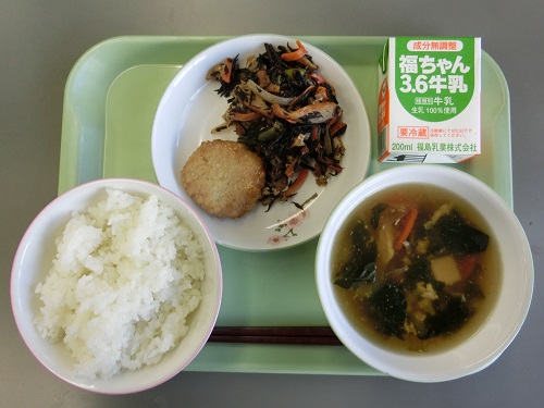 今日の給食のメニューは,ごはん,牛乳,味付けつくね,ひじきの煮物,なめこと卵のスープでした。