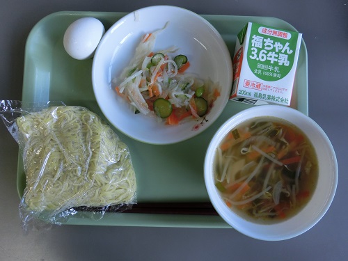今日の給食のメニューは,中華めん,牛乳,味付けゆでたまご,大根のサラダ,