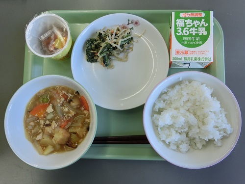 今日の給食メニューは、ごはん、牛乳、野菜のごまあえ、じゃがいものそぼろ煮、納豆でした。美味しくいただきました。
