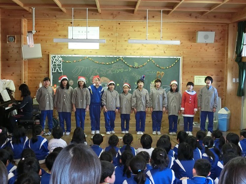 21日(水)の業間の時間を利用し、特設合唱部11名によるクリスマスミニミニコンサートを多目的ホールで開きました。休み時間ではありましたが、1年生から6年生までたくさんの子どもたちが集いました。合唱部の「サンタが町にやって来る」「ジングルベル」の発表の後、今月の歌「あわてんぼうのサンタクロース」を集まった全員で歌いました。短い時間でしたが、楽しいひとときを過ごすことができました。