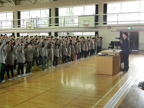 22日(木)10時10分から体育館で第2学期終業式を実施しました。82日間の登校日があった第2学期、校長先生の話の中で、第2学期を振り返り10項目について、児童一人ひとりが振り返り手を挙げました。その項目を紹介します。