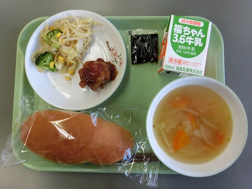 今日の給食メニューは,牛乳,ごはん,ごぼうメンチ,もやしのおかかあえ,みそけんちん汁でした。
