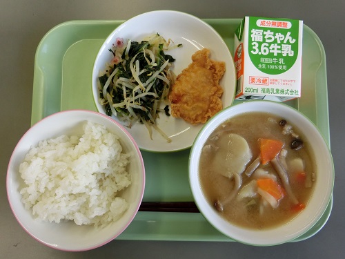 今日は、大分県の郷土料理が給食に出ました。メニューは、ごはん、牛乳、鶏てんぷら、おかかあえ、だんご汁でした。なかなか口にできない食事で、とても美味しかったです。