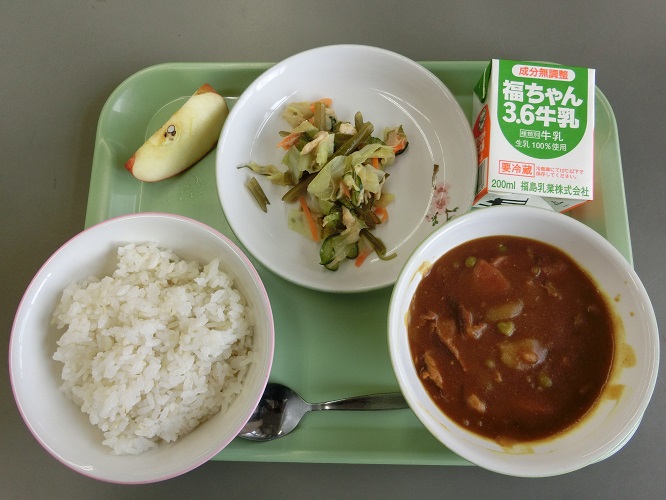 今日の給食のメニューは、麦ごはん、牛乳、ポークカレー、わかめの茎の部分を使った茎わかめのサラダ、りんごでした。