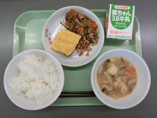 今日の給食メニューは、減量ごはん、牛乳、凍み豆腐入り五目ごはんの具、千草焼、じゃがもち汁でした。千草焼は、たくさんの具材を玉子でとじた玉子焼きです。栄養がたっぷりで美味しかったです。