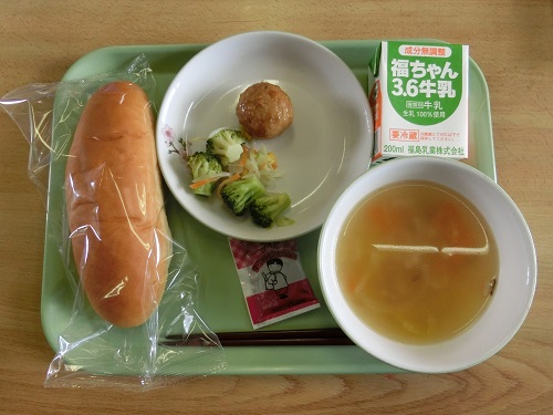 本日の給食メニューは、牛乳、コッペパン、大豆チョコ、うずらの卵スコッチエッグ、グリーンサラダ、秋野菜のコンソメです。