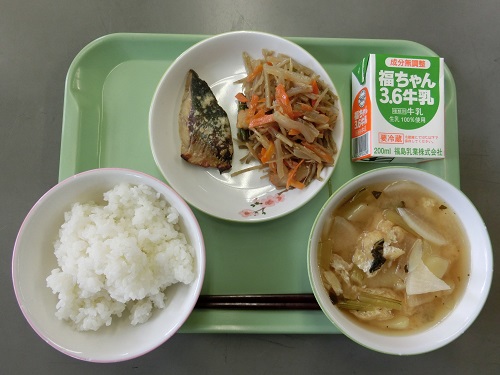今日の給食は、牛乳、ごはん、あじの塩麹焼き、五目きんぴら、大根のみそ汁でした。
