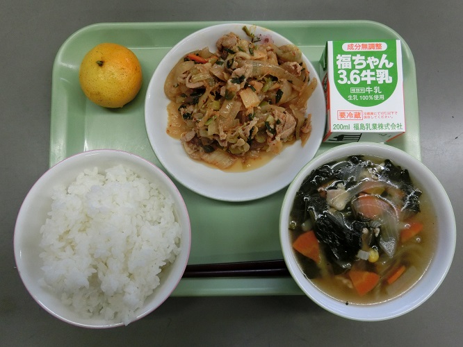 今日の給食メニューは、牛乳、ごはん、ぶたキムチ丼、ポテトスープ、みかんでした。