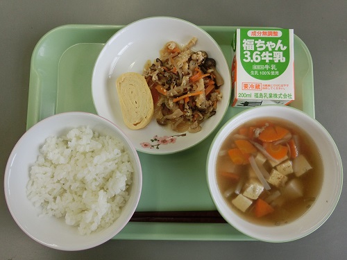 今日の給食は、七五三のお祝い献立です。メニューは、牛乳、減量ごはん、きのこごはんの具、だしまき卵、ざくざくでした。七五三、おめでとうございます!