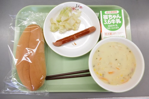 メニューは、牛乳、切れ目コッペパン、フランクフルトソースがけ、ボイルキャベツ、