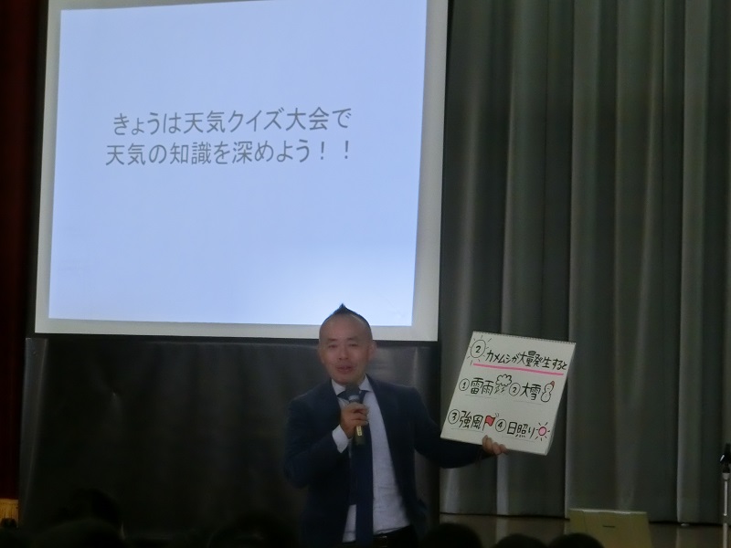 斎藤さんからは、「一生懸命やることが大切であること」を、自分の履歴をもとに、子どもたちにもわかりやすくお話されました。また、天気クイズ大会を通して、天気の知識を深めることができました。さらに、全問正解者には、素敵なプレゼンタが贈られました。