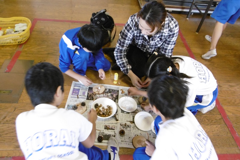 4日(金)3・4校時に、1年生は、毎年お世話になっている只野さんらを講師に、中央公園から自分たちが拾ってきたどんぐりや松ぼっくりを使って飾りを作りました。