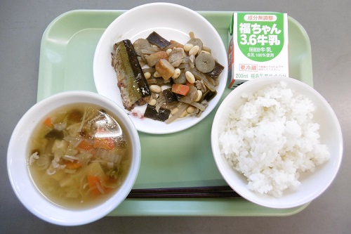 今日は和食の日です。メニューは、ごはん、牛乳、さんまのしょうが煮、五目豆、きのこ汁でした。