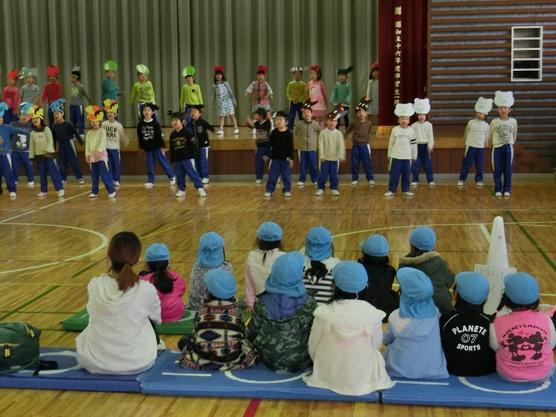 はじめに、体育館で学習発表会の時に演じた「サラダでげんき」を発表しました。また、一緒にしっぽとりゲームをしました。