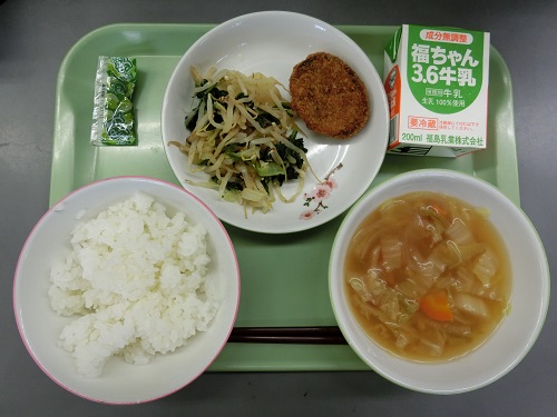 ごはん、牛乳、パックソース、ひじきコロッケ、おかかあえ、白菜のスープ