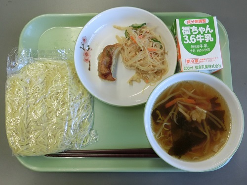 今日の給食メニューは、しょうゆラーメン、しそぎょうざ、バンバンジーサラダ