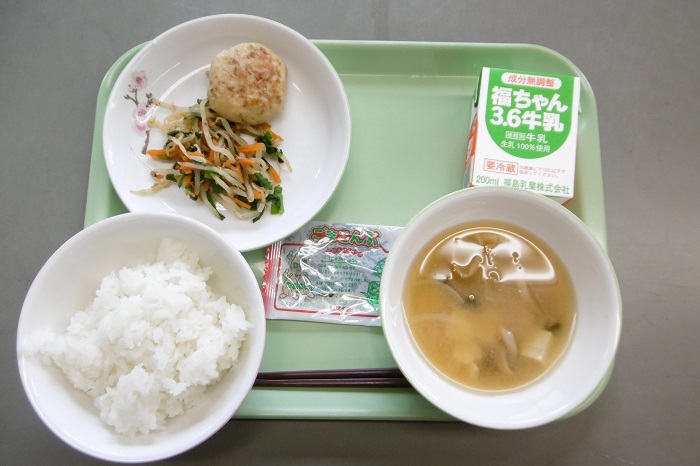 今日の献立は和食でした。メニューは、ご飯、牛乳、豆腐のそぼろあんつつみ、おかかあえ、大根の味噌汁でした。