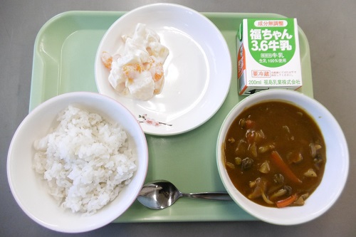 今日は、牛乳、麦ご飯、きのこカレー、フルーツヨーグルトあえでした。