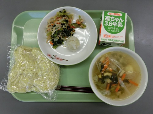 牛乳、中華麺、えびの水晶つつみ、こまツナサラダ、タンメンスープ。