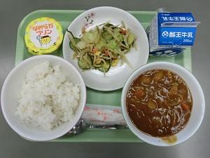 今日の給食は「平石小お祝い献立」です。メニューは、麦ごはん、牛乳、ポークカレー、ごぼう中華サラダ、プリンでした。710kcalです。3月生まれの皆さん、お誕生日おめでとうございます。