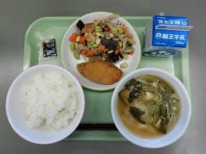 今日の給食は「和食の日」メニューです。ごはん、パックしょうゆ、牛乳、ますフライ、五目豆、小松菜のみそ汁でした。691kcalです。