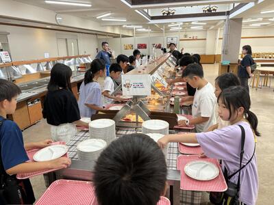 宿泊学習2日目の朝を迎えました。みんな元気な様子です。班ごとに協力しながらビュッフェ形式での朝食です。しっかり食べて今日も一日頑張ろう。