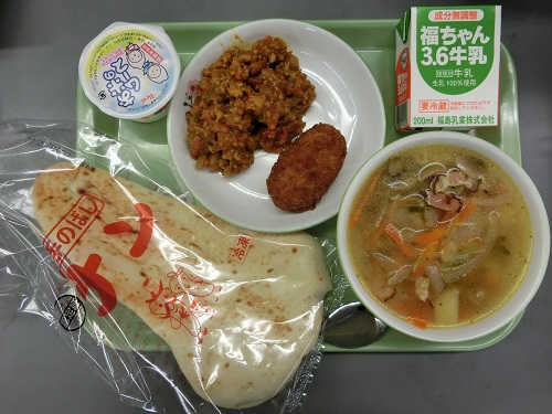 2月17日の給食献立! 2017年2月17日 14時02分 今日の出来事 今日の給食メニューは、松川小学校考案の2月生まれお誕生日おめでとう献立です。牛乳、ナン、ドライカレー、かぼちゃのコロッケ、コンソメスープ、お米のムースでした。