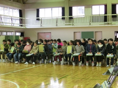 3日(木)6校時に、3年生から6年生までが体育館で児童会活動発表会をしました。