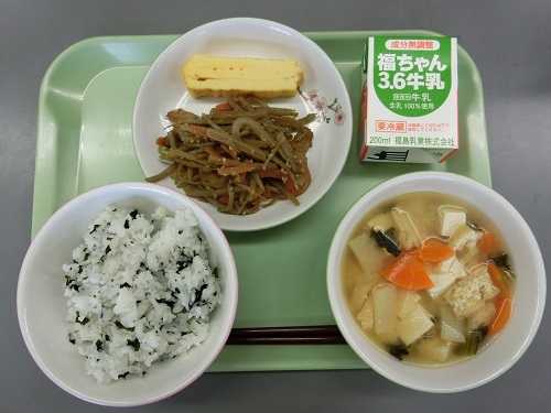 今日の給食はかみかみ献立でした。メニューは、わかめごはん、牛乳、厚焼きたまご、五目きんぴら、青菜のみそ汁でした。