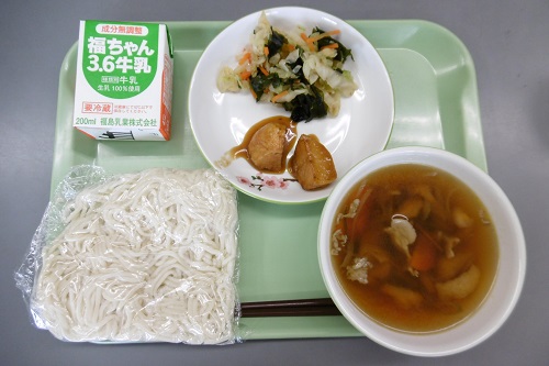 今日の給食は、「郡山市ふるさと献立」でした。メニューは、ソフト麺、牛乳、味噌かんぷら