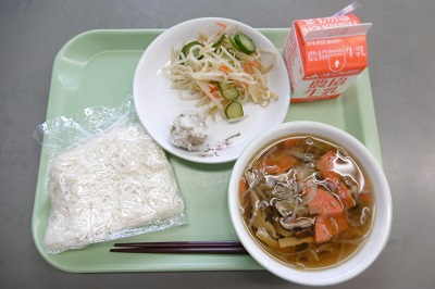 今日の給食は、ソフトめん、牛乳、もち米肉だんご、もやしサラダ、五目うどんかけ汁でした。