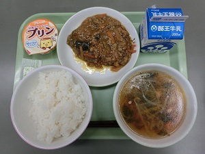 2018年7月17日 12時50分今日は、リザーブ給食の日でした。メニューは、牛乳、ごはん、マーボーなす、春雨スープ、デザートは豆乳プリンかはちみつレモンゼリーを選んでいただきました。 今日の献立のメニューにも使われましたが、なすは体のぼせやほてりをとり、血圧を下げるはたらきがあります。まさに今の暑い時期にぴったりの食材です。なすを使った料理、ご家庭でもいかがでしょうか。