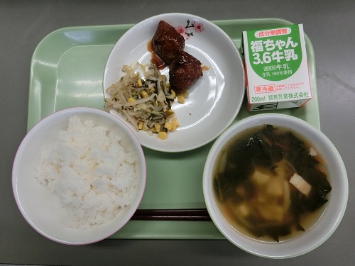 今日の給食献立は、牛乳、ごはん、つくね、わさびドレッシングサラダ、ほうれん草のスープでした。