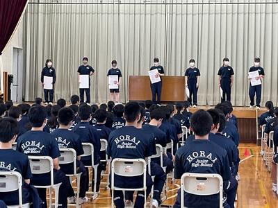 また、お昼の放送では、各部から「中体連への意気込み」や「中体連大会の応援メッセージ」の発表が始まりました。